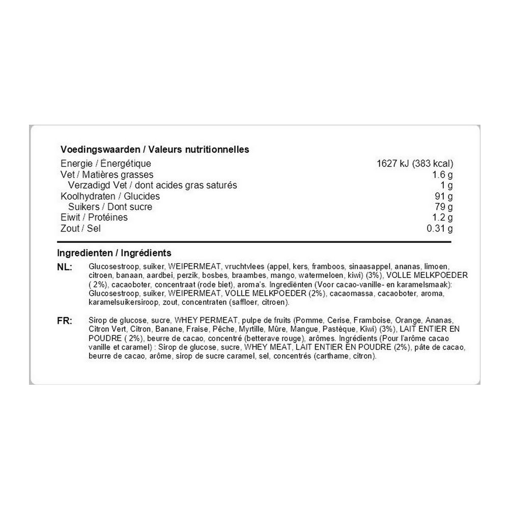Ingredients: Glucose syrup, sugar, WHEY PERMEAT, fruit pulp (apple, cherry, raspberry, orange, pineapple, lime, lemon, banana, strawberry, peach, blueberry, blackberry, mango, watermelon, kiwi) (3%), WHOLE MILK POWDER (2%), cocoa butter , Concentrate (Beetroot), Flavourings. Ingredients (For cocoa-vanilla and caramel flavor): Glucose syrup, sugar, WHEY PERMEAT, WHOLE MILK POWDER (2%), cocoa mass, cocoa butter, flavoring, caramel sugar syrup, salt, concentrates (safflower, lemon).