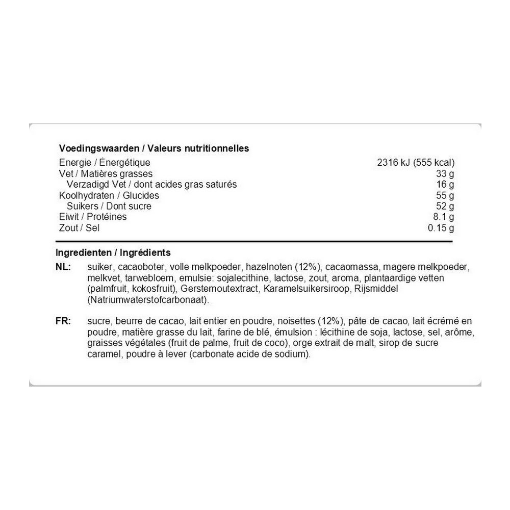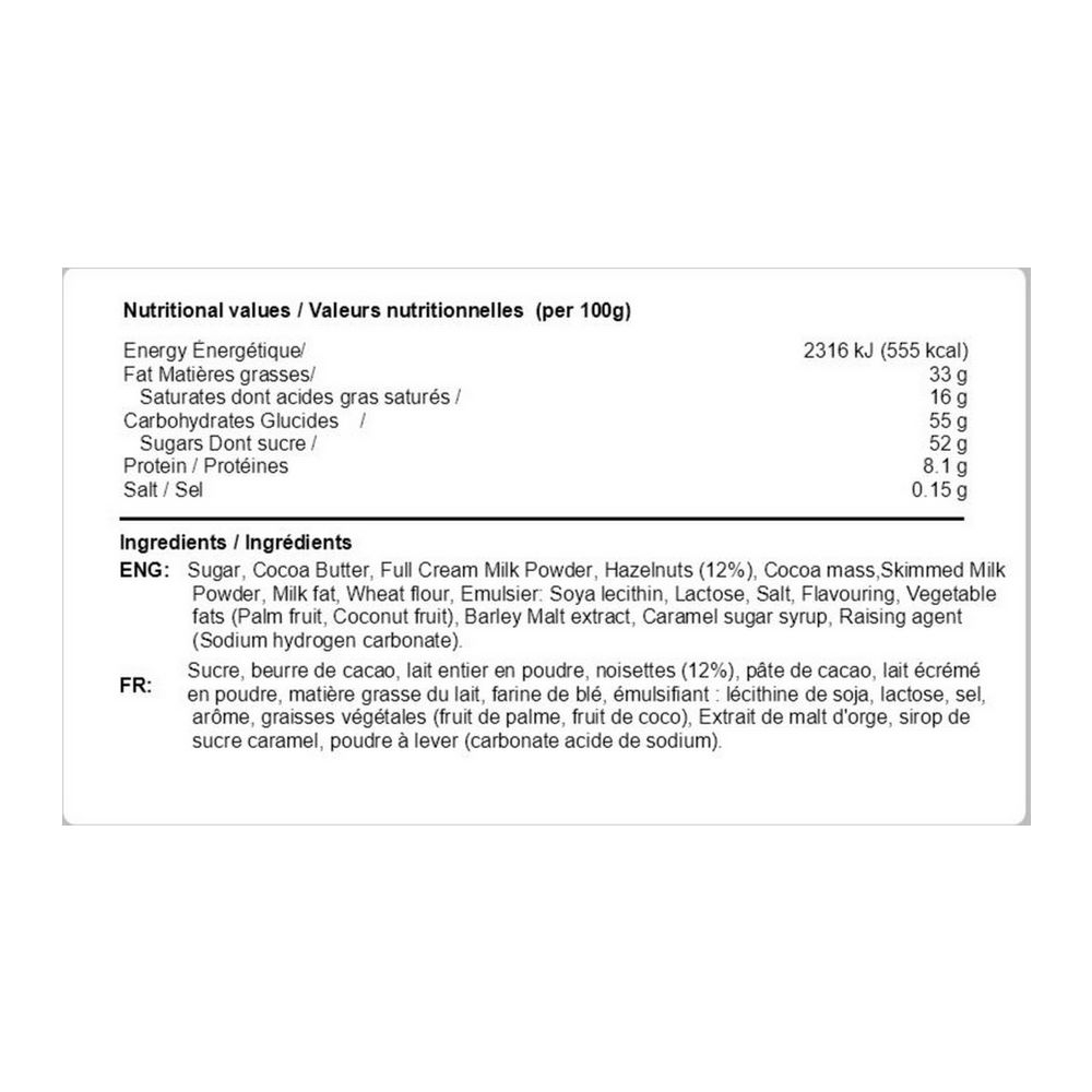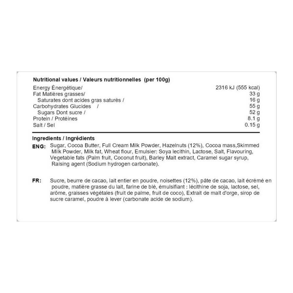Ingredients: Sugar, Cocoa Butter, Full Cream Milk Powder, Hazelnuts (12%), Cocoa mass,Skimmed Milk Powder, Milk fat, Wheat flour, Emulsier: Soya lecithin, Lactose, Salt, Flavouring, Vegetable fats (Palm fruit, Coconut fruit), Barley Malt extract, Caramel sugar syrup, Raising agent (Sodium hydrogen carbonate).